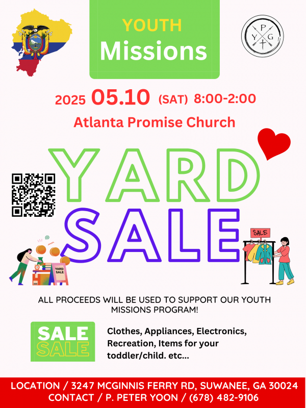 프라미스 교회는 연례 야드세일의 시작을 여러분께 알리게 되어 매우 기쁩니다!