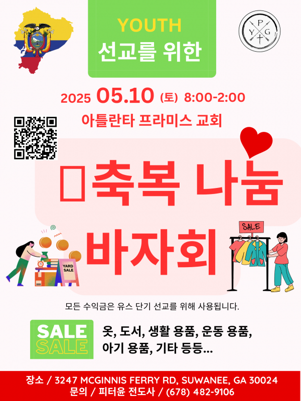 모든 수익금은 11월 에콰도르로 떠나는 청소년 선교 활동을 위해 사용됩니다!