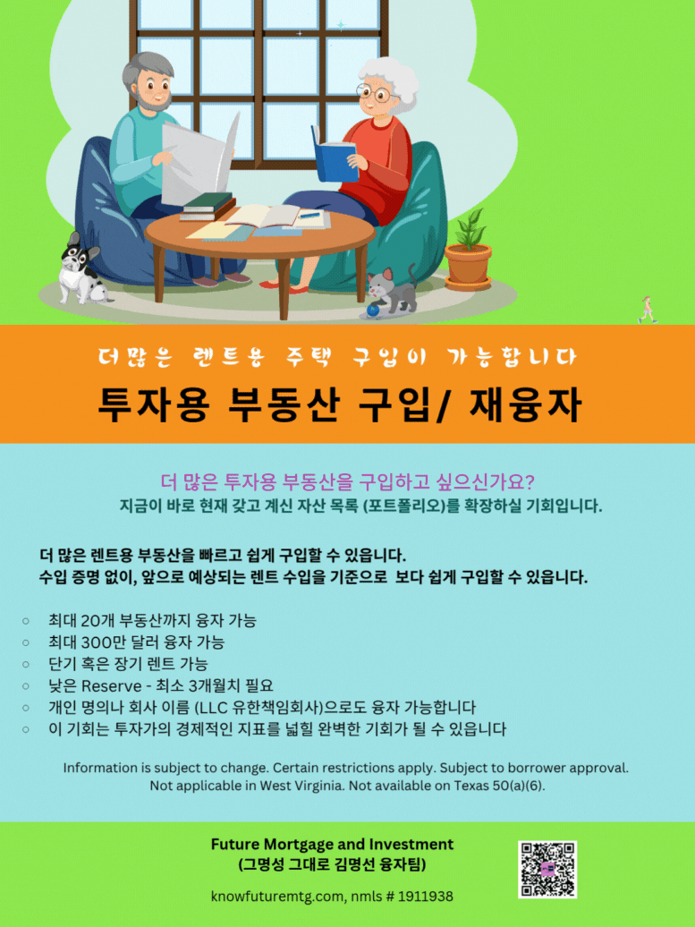 • 개인명의나 회사이름 (LLC 유한책임회사)으로도 융자 가능 합니다