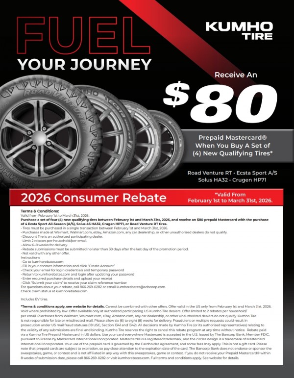 ✅ 금호타이어 Rebate 프로그램 : 3월 31일까지 Ecsta Sport A/S, Sulus HA32, Crugen HP71 4세트 구매시 $80 Prepaid Mastercard Rebate(자세한건 매장에 문의해주세요.)