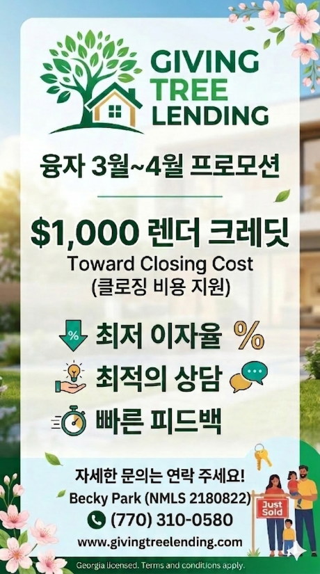 봄 이사 시즌과 재융자 시즌을 맞아 Giving Tree Lending에서 고객님들을 위한 특별한 혜택을 준비했습니다. 내 집 마련의 꿈과 효율적인 자산 관리를 위해 지금 바로 전문가의 도움을 받으세요!