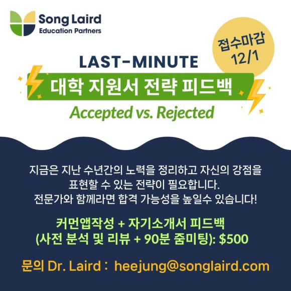 미국대학입시 전문 컨설턴트 송레어드 에듀케이션 파트너스에서 ?12학년을 위한 막바지 대입 준비?프로그램을 안내드리고자합니다. (접수 마감일 2025/12/1)