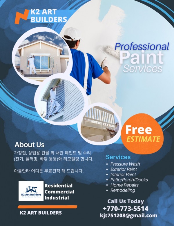 가정집, 상업용 건물 외 내관 페인트 및 수리(전기, 플러밍, 바닦 등등)와 리모델링 합니다. 아틀란타 어디든 무료견적 해 드립니다.