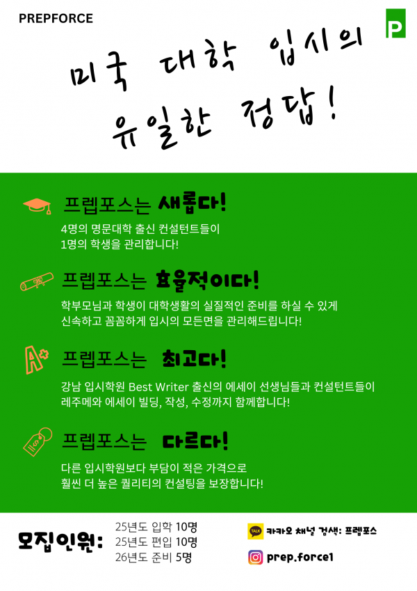 안녕하세요. 미국 입시의 정답! 프렙포스입니다.