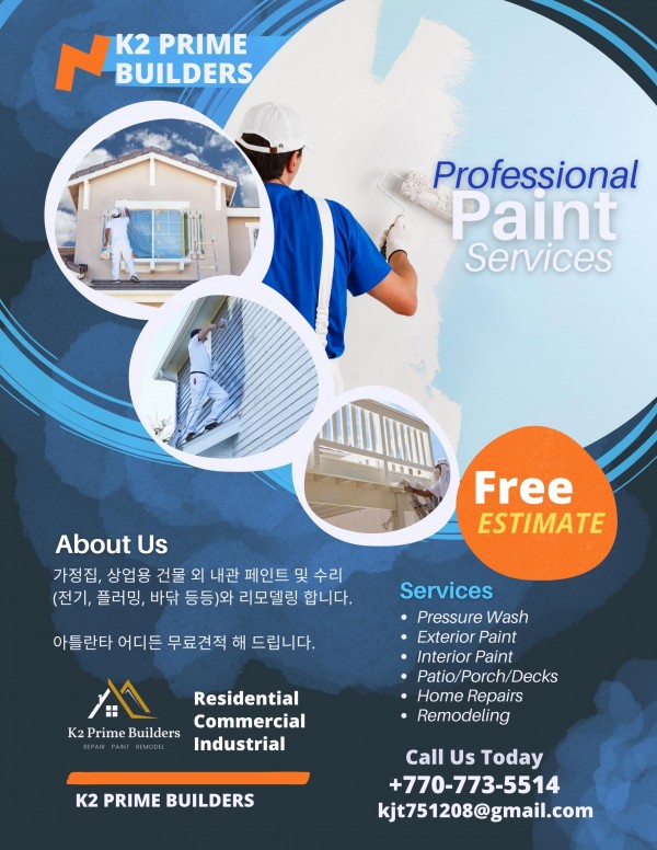 가정집, 상업용 건물 외 내관 페인트 및 수리(전기, 플러밍, 바닦 등등)와 리모델링 합니다.  아틀란타 어디든 무료견적 해 드립니다.