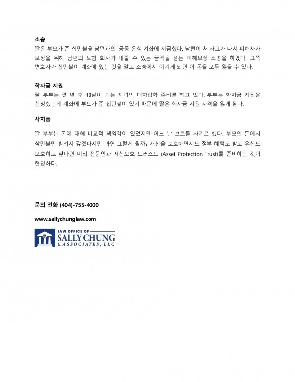 병은 전문의에게, 재산보호 및 상속계획은 샐리정 전문 변호사에게!