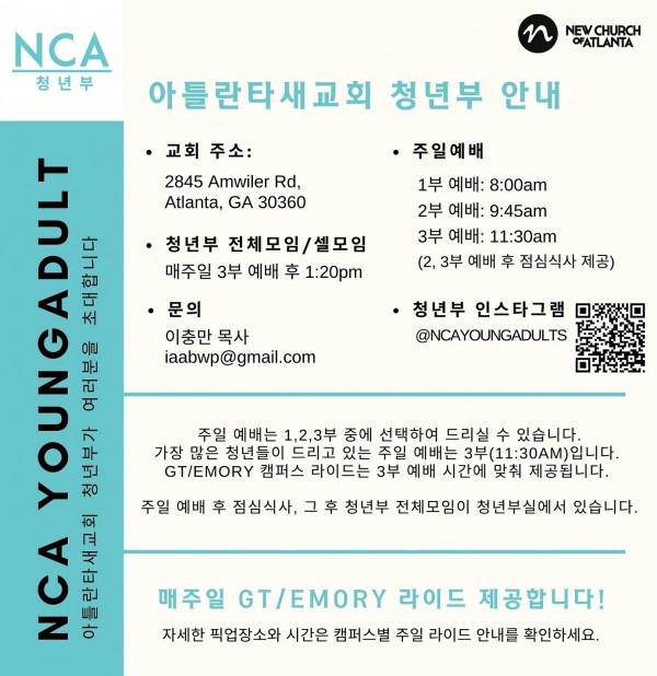 - 다음글아틀란타 새교회 청년부에서 GT에 주일 예배를 위한 라이드를 제공합니다! 24.09.24