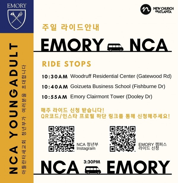 아틀란타 새교회 청년부에서 Emory 대학에 주일 예배를 위한 라이드를 제공합니다!