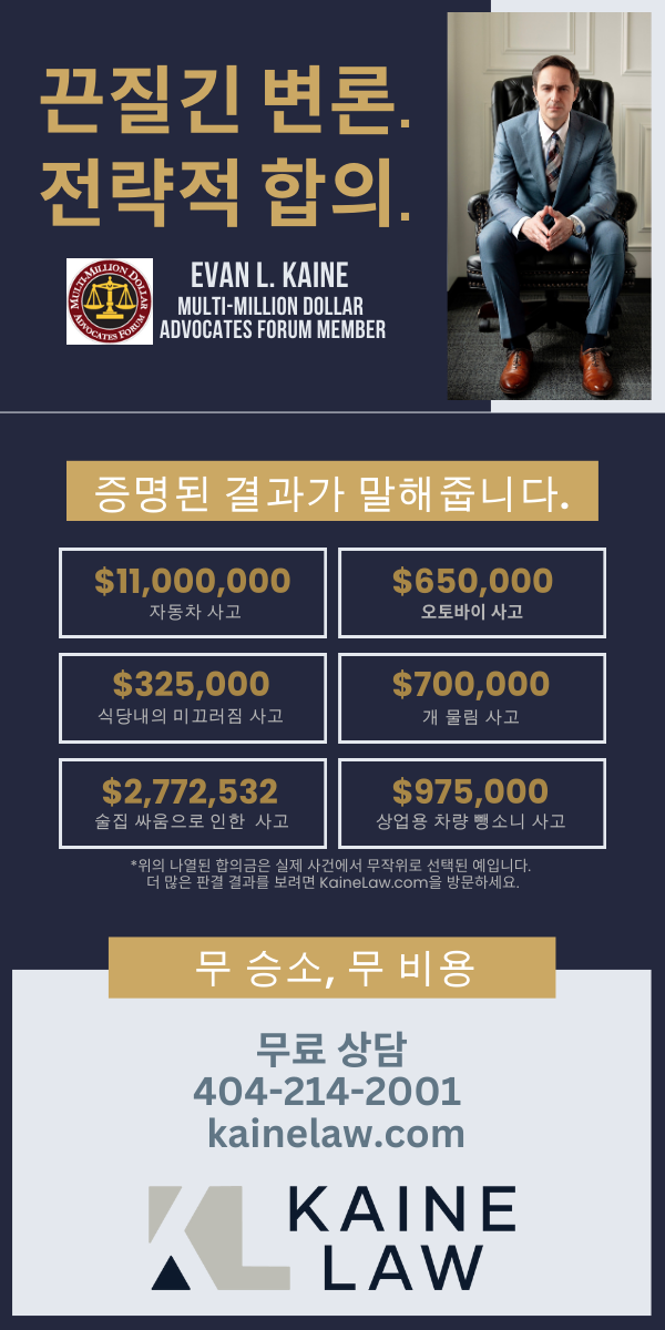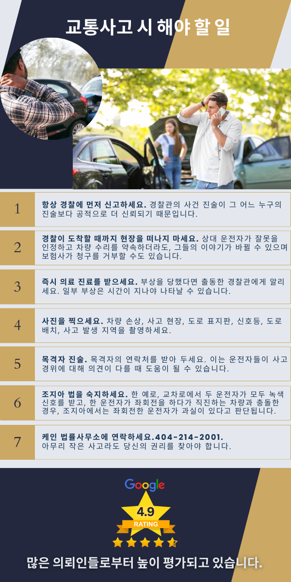 경찰에 신고하고 현장을 기록하며, 필요한 경우 즉시 의료 진료를 받으세요. 케인 법률사무소가 여러분의 권리를 보호하고 정당한 보상을 받을 수 있도록 최선을 다하겠습니다. 무료 상담을 위해 지금 바로 연락해 주세요.