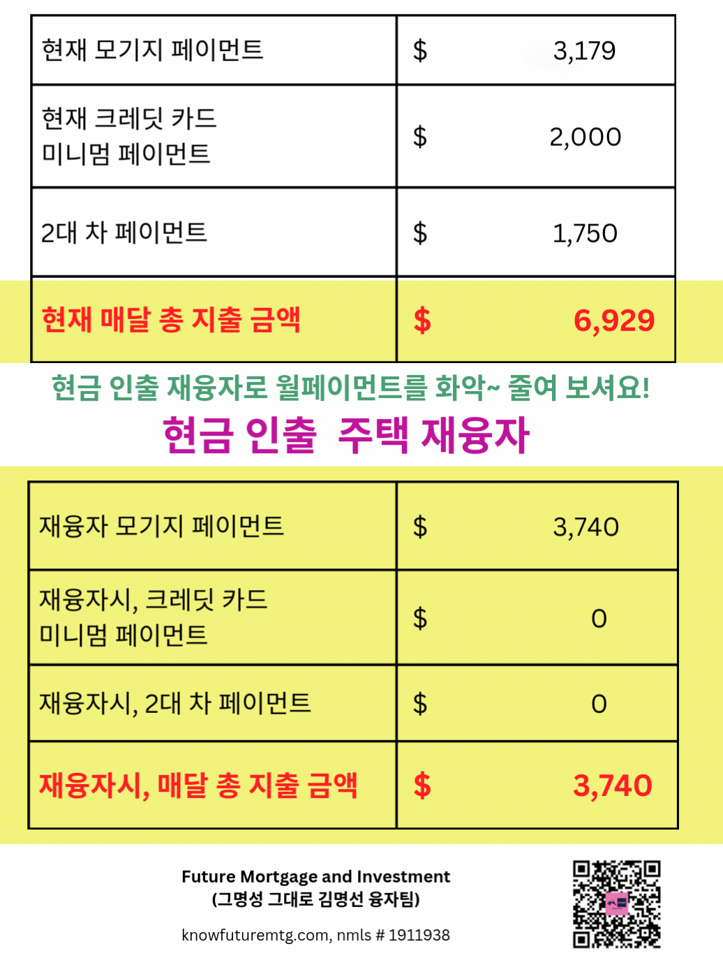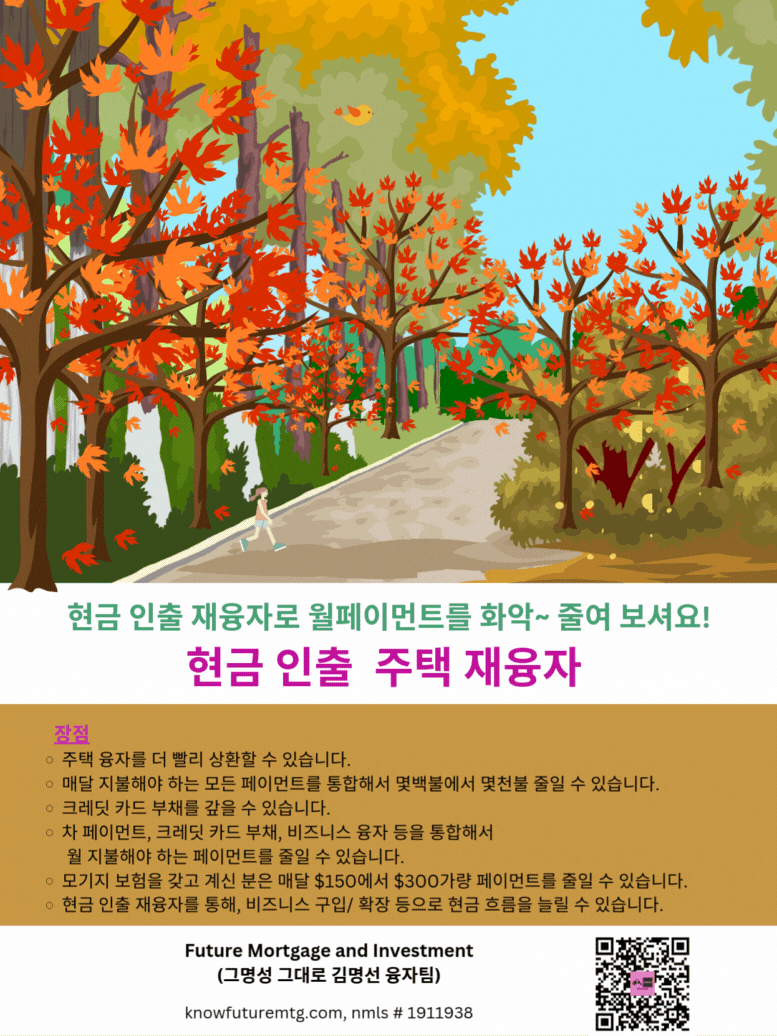 주의 사항: 융자는 돈 (신용)이고 돈 (신용) 은 빚입니다. 융자를 잘 활용하면 자산 증식이나 경제 생활에 큰 이익을 주지만, 그렇지 못할 경우, 집을 잃거나 경제적인 파국의 원인이 될수 있읍니다. 육체적인 고통이나 정신적인 고통은 911을 누르시고, 채무로 인한 경제적인 고통은 CFPB, Financial Counselor 혹은 가까운 융자 전문가에게 문의 하셔요.