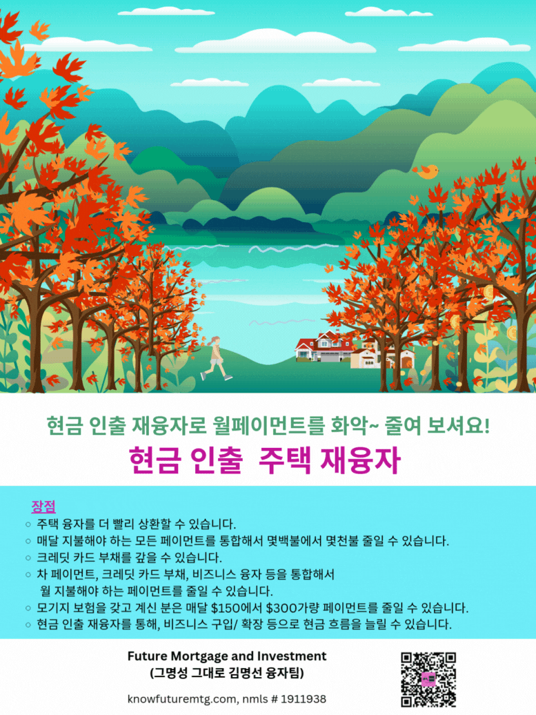 주의 사항: 융자는 돈 (신용)이고 돈 (신용) 은 빚입니다. 융자를 잘 활용하면 자산 증식이나 경제 생활에 큰 이익을 주지만, 그렇지 못할 경우, 집을 잃거나 경제적인 파국의 원인이 될수 있읍니다. 육체적인 고통이나 정신적인 고통은 911을 누르시고, 채무로 인한 경제적인 고통은 CFPB, Financial Counselor 혹은 가까운 융자 전문가에게 문의 하셔요.