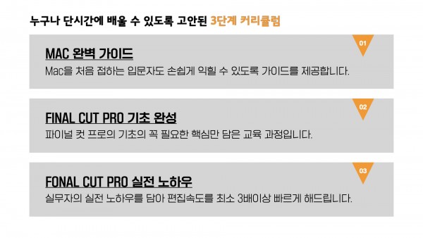 - 파이널컷 프로의 기본적인 기초과정은 물론, 혼자서 영상을 만들고 음악을 넣고, 효과음을 넣고, 영상을 애니메이션하는 효과, 타임리매핑, 키프레이밍, 기본적인 파이널컷의 효과 이해하기