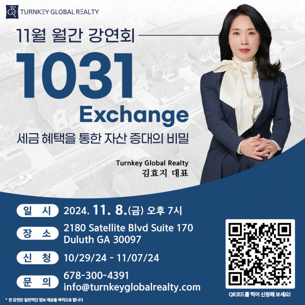 일시: 2024년 11월 8일 금요일 저녁 7시 장소: 2180 Satellite Blvd Suite 170, Duluth, GA, 30097 참석 인원: 선착순 30명 강연 문의 전화: 678-300-4391 강연 문의 이메일: tkgrmarketing@turnkeyglobalrealty.com