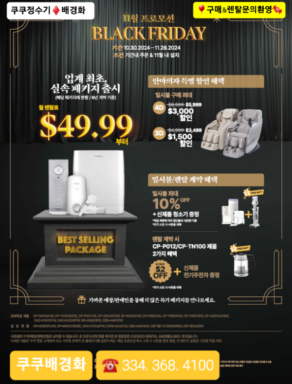 [쿠쿠정수기♦️배경화]11월프로모션 BLACK FRIDAY 시작!! 업계최초 실속패키지도입!! 파격적인 렌탈료!!등록비100불…