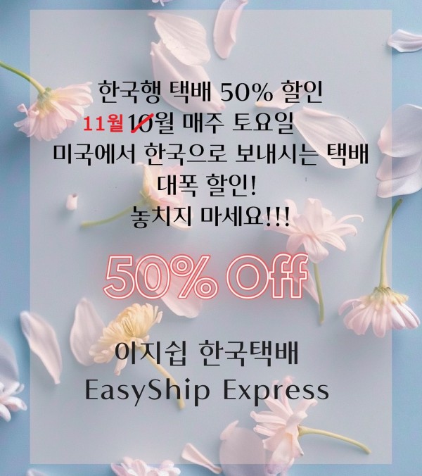 10월에 이어 11월에도 한달간 매주 토요일 한국으로 보내시는 택배의 50% 할인혜택의 기회가 있으니 절대 놓치지 마세요~~~