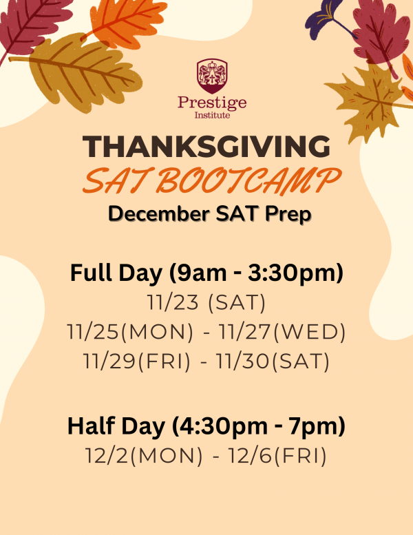 다가오는 12월 SAT 시험 준비를 위해 Prestige 알파레타 지점에서 Thanksgiving Bootcamp 프로그램을 개최합니다!