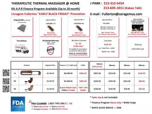 - 얼리 블랙프라이데이 선물로 V6 구매시 세라믹스 S1 온열매트를 ($700 Value) 드립니다.^^