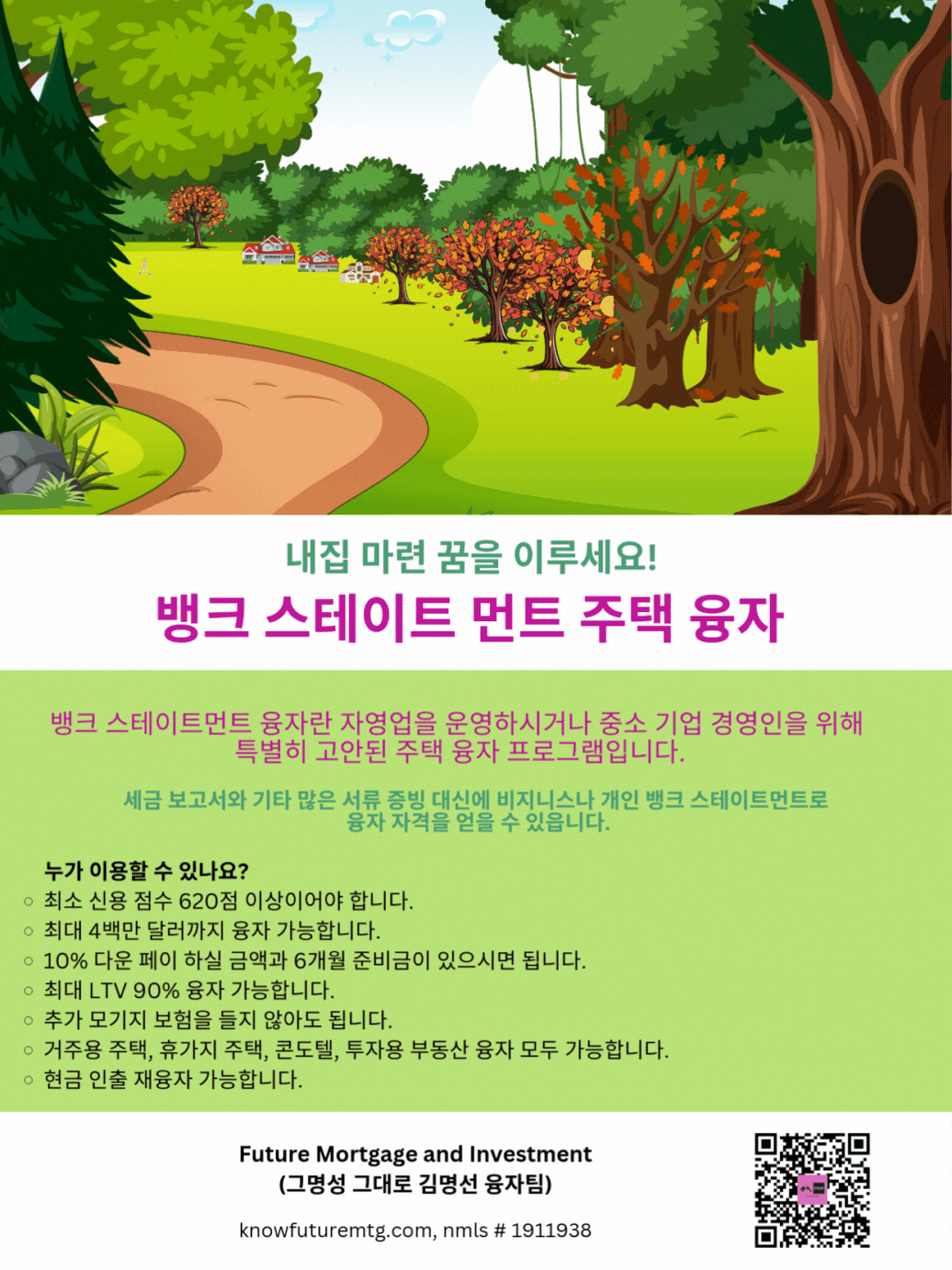 뱅크 스테이트먼트 융자 프로그램으로 주택 구입의 꿈을 이루셔요~