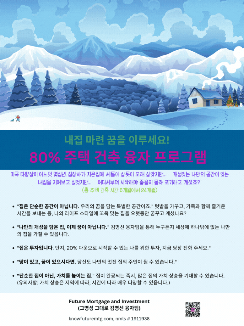 주의 사항: 융자는 돈 (신용)이고 돈 (신용) 은 빚입니다. 융자를 잘 활용하면 자산 증식이나 경제 생활에 큰 이익을 주지만, 그렇지 못할 경우, 집을 잃거나 경제적인 파국의 원인이 될수 있읍니다. 육체적인 고통이나 정신적인 고통은 911을 누르시고, 채무로 인한 경제적인 고통은 CFPB, Financial Counselor 혹은 가까운 융자 전문가에게 문의 하셔요.