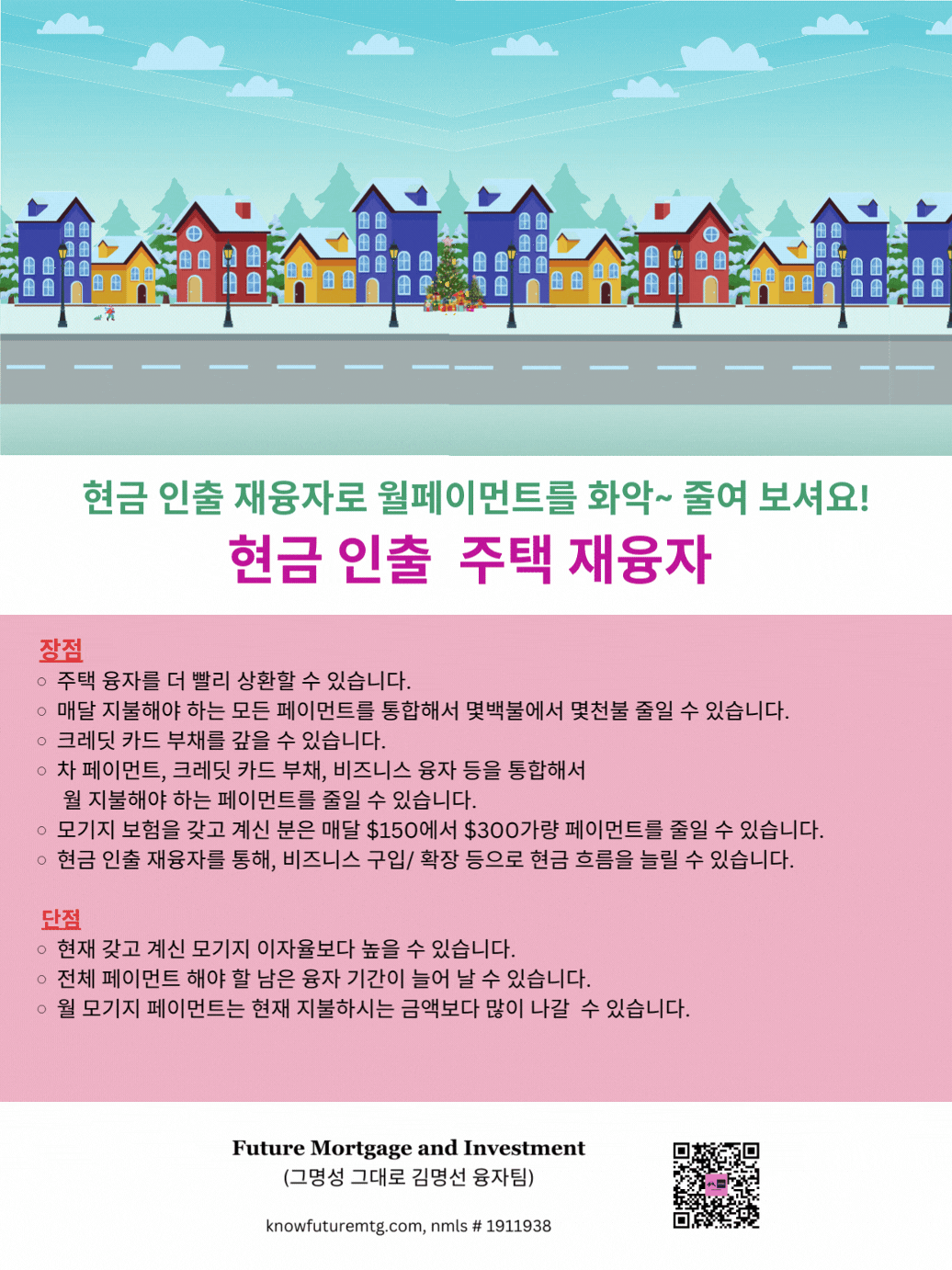 현금 인출 재융자로 월페이먼트를 화악 ~ 줄여 보셔요!
