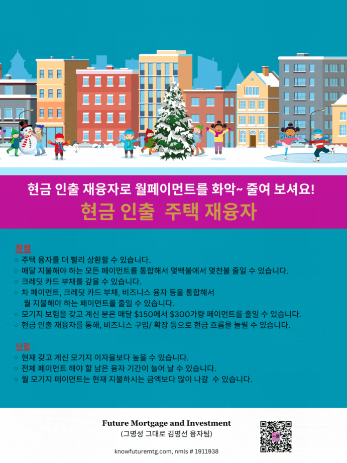현금 인출 재융자로 월페이먼트를 화악 ~ 줄여 보셔요!