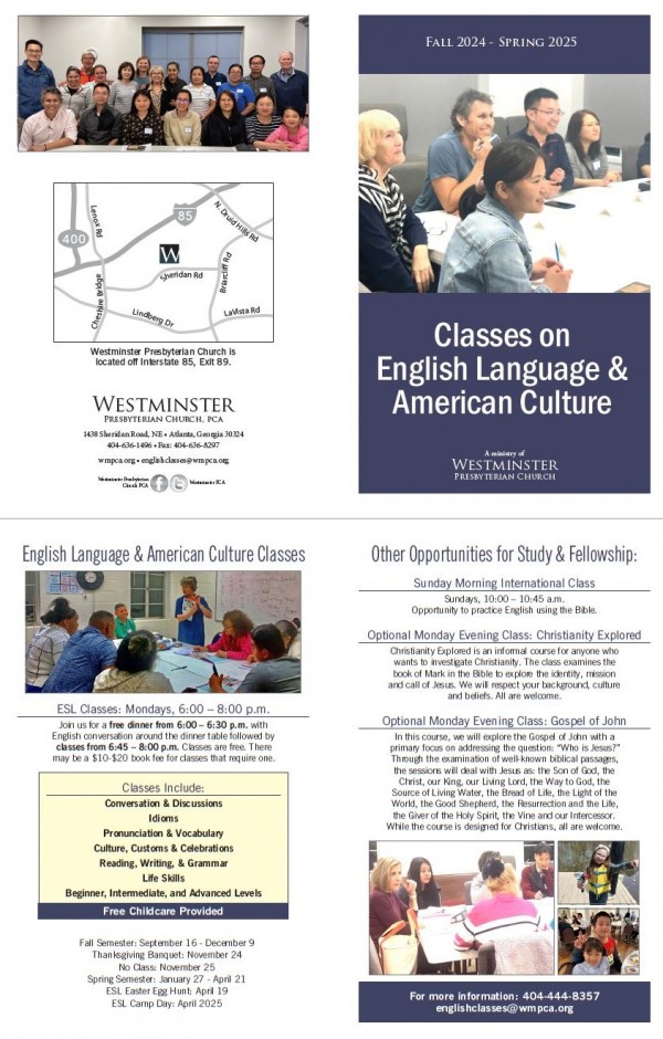 에모리대학 근처 (조지아텍 15분 거리)에 위치한 Westminster Presbyterian Church 에서 주관하는 무료 ESL 수업 새학기가 시작되어 알려드립니다.