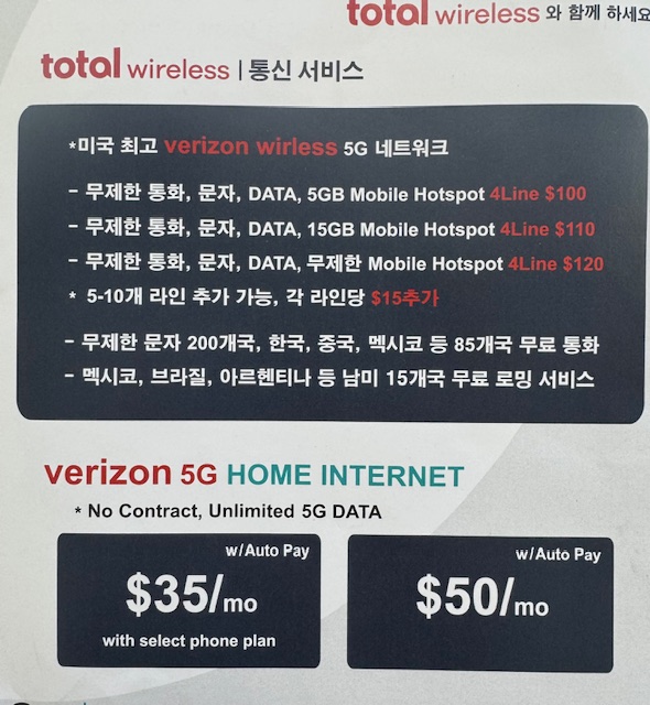 TOTAL WIRELESS BY VERIZON 통신회사로 가져오시면 프로모션이 있습니다.)