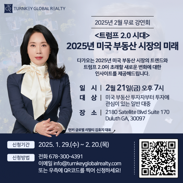 2월 21일 저녁 7시, 조지아주 둘루스에 위치한 Turnkey Global Realty 컨퍼런스룸에서 열리는 강연회의 참가 인원은 선착순 30명으로 제한되며, 강연 참가를 원하시는 분들은 아래 신청폼 링크를 클릭하시거나, 간편하게 전화,이메일 또는 웹사이트를 통해 신청하실 수 있습니다.