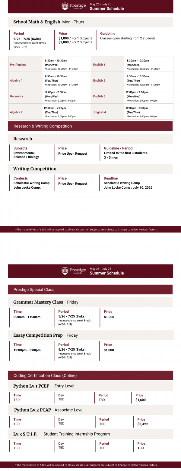 Prestige Institute의 2025 여름 학기가 5월 25일부터 7월 25일까지 진행됩니다.