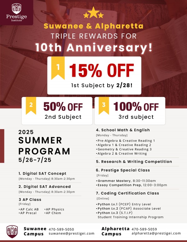 Prestige Institute가 개원 10주년을 맞아 학부모님과 학생 여러분께 감사의 마음을 담아 특별 할인 혜택을 제공해드립니다.