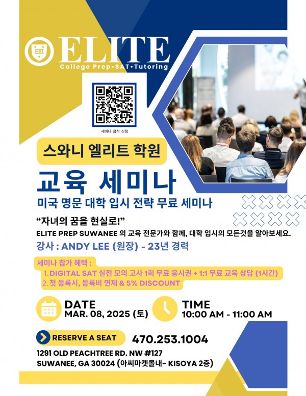 미 전국에서 SAT 고득점자를 가장 많이 배출한 38년 경험의 SAT 전문 학원인, 스와니 엘리트 학원 (Elite Prep Suwanee) 에서 미국 명문대 입시전략! 무료 교육 세미나에 초대합니다.