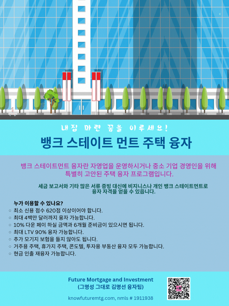 주의 사항: 융자는 돈 (신용)이고 돈 (신용) 은 빚입니다. 융자를 잘 활용하면 자산 증식이나 경제 생활에 큰 이익을 주지만, 그렇지 못할 경우, 집을 잃거나 경제적인 파국의 원인이 될수 있읍니다. 육체적인 고통이나 정신적인 고통은 911을 누르시고, 채무로 인한 경제적인 고통은 CFPB, Financial Counselor 혹은 가까운 융자 전문가에게 문의 하셔요.