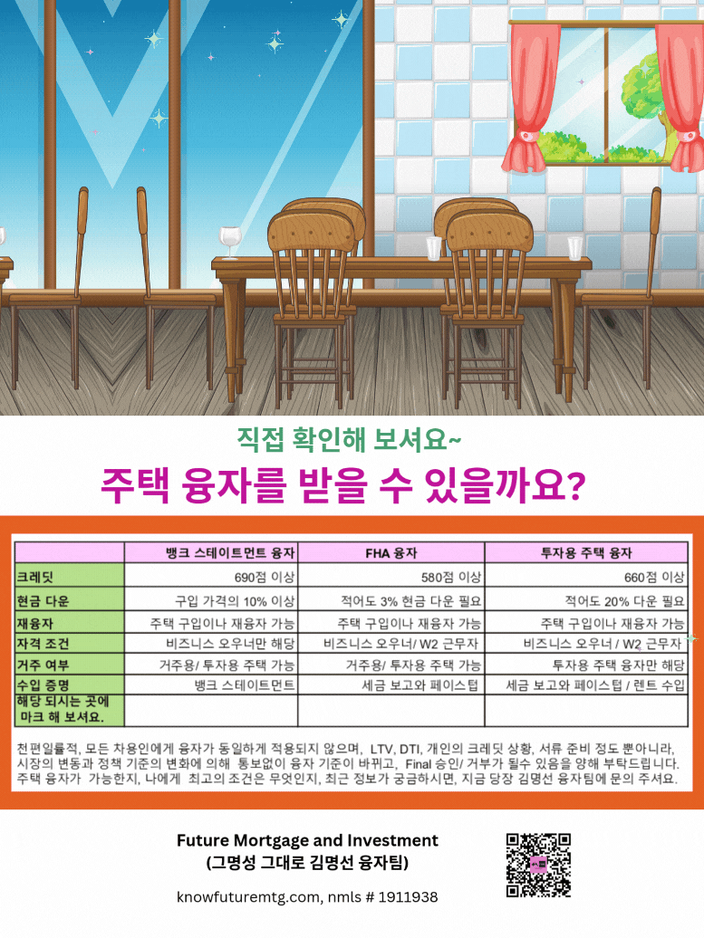 주의 사항: 융자는 돈 (신용)이고 돈 (신용) 은 빚입니다. 융자를 잘 활용하면 자산 증식이나 경제 생활에 큰 이익을 주지만, 그렇지 못할 경우, 집을 잃거나 경제적인 파국의 원인이 될수 있읍니다. 육체적인 고통이나 정신적인 고통은 911을 누르시고, 채무로 인한 경제적인 고통은 CFPB, Financial Counselor 혹은 가까운 융자 전문가에게 문의 하셔요.