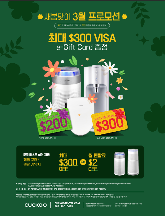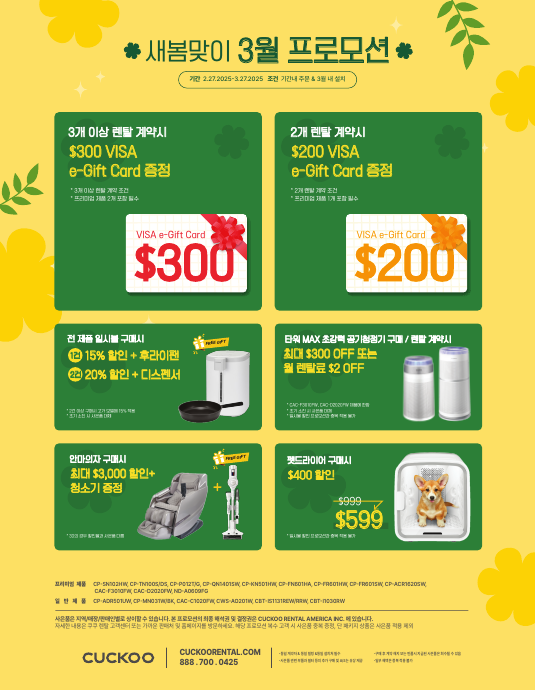 - 고급형 2대 + 일반형 1대시 $300 비자카드 증정