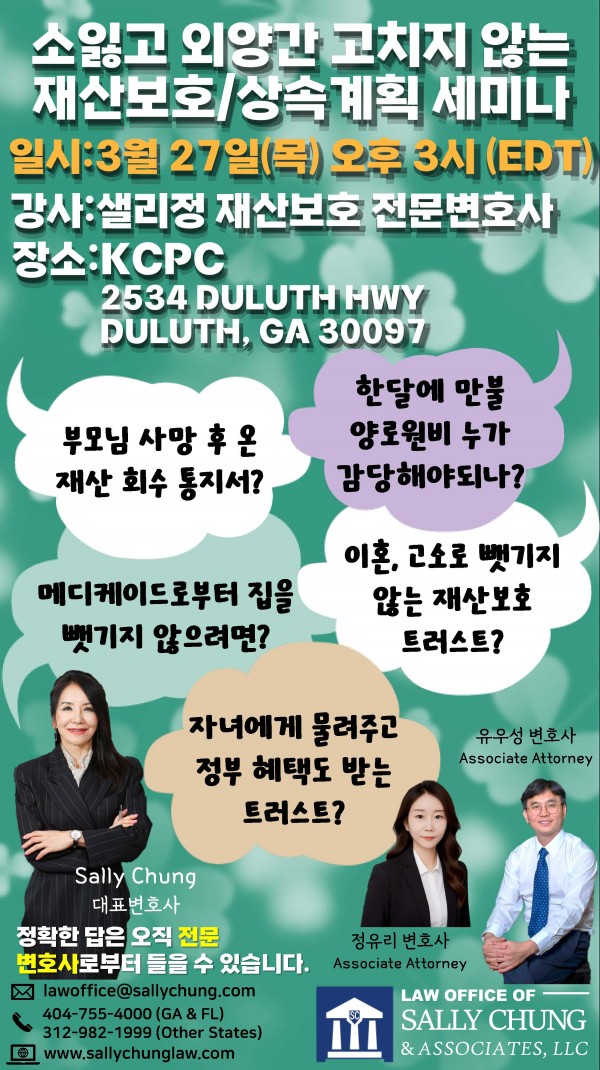 소잃고 외양간 고치지 않는 재산보호/상속계획 세미나에 초대합니다.