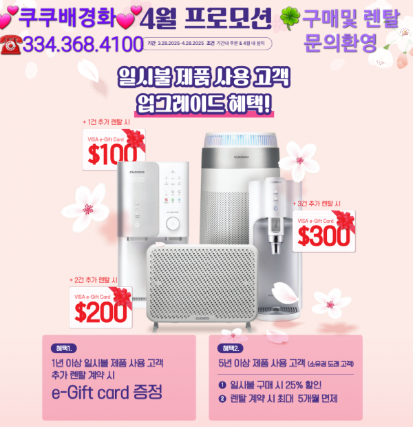 [쿠쿠정수기♦️배경화] 쿠쿠4월프로모션 시작 3/28-4/28일까지 등록비할인외 비자카드300불(최대)