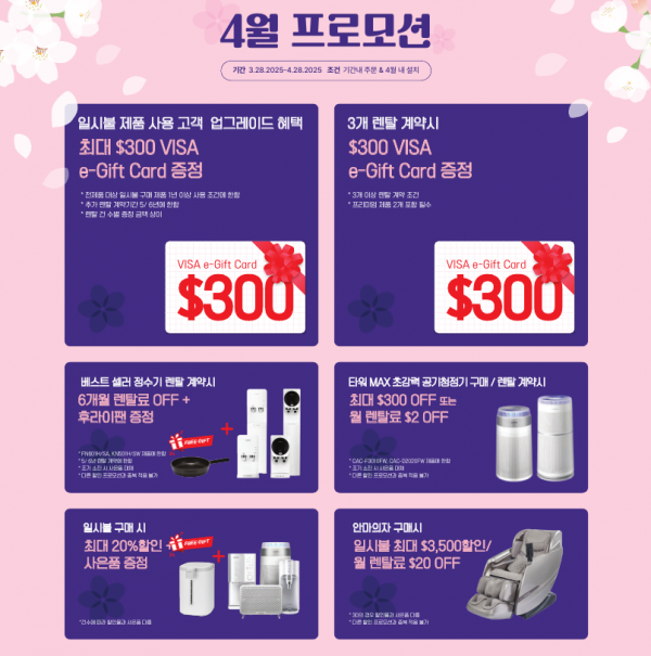 렌탈 복수 구매시 청소기 지급, 3개 이상 구매시 $300 visa 카드 드립니다.