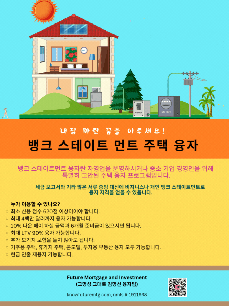 주의 사항: 융자는 돈 (신용)이고 돈 (신용) 은 빚입니다. 융자를 잘 활용하면 자산 증식이나 경제 생활에 큰 이익을 주지만, 그렇지 못할 경우, 집을 잃거나 경제적인 파국의 원인이 될수 있읍니다. 육체적인 고통이나 정신적인 고통은 911을 누르시고, 채무로 인한 경제적인 고통은 CFPB, Financial Counselor 혹은 가까운 융자 전문가에게 문의 하셔요.