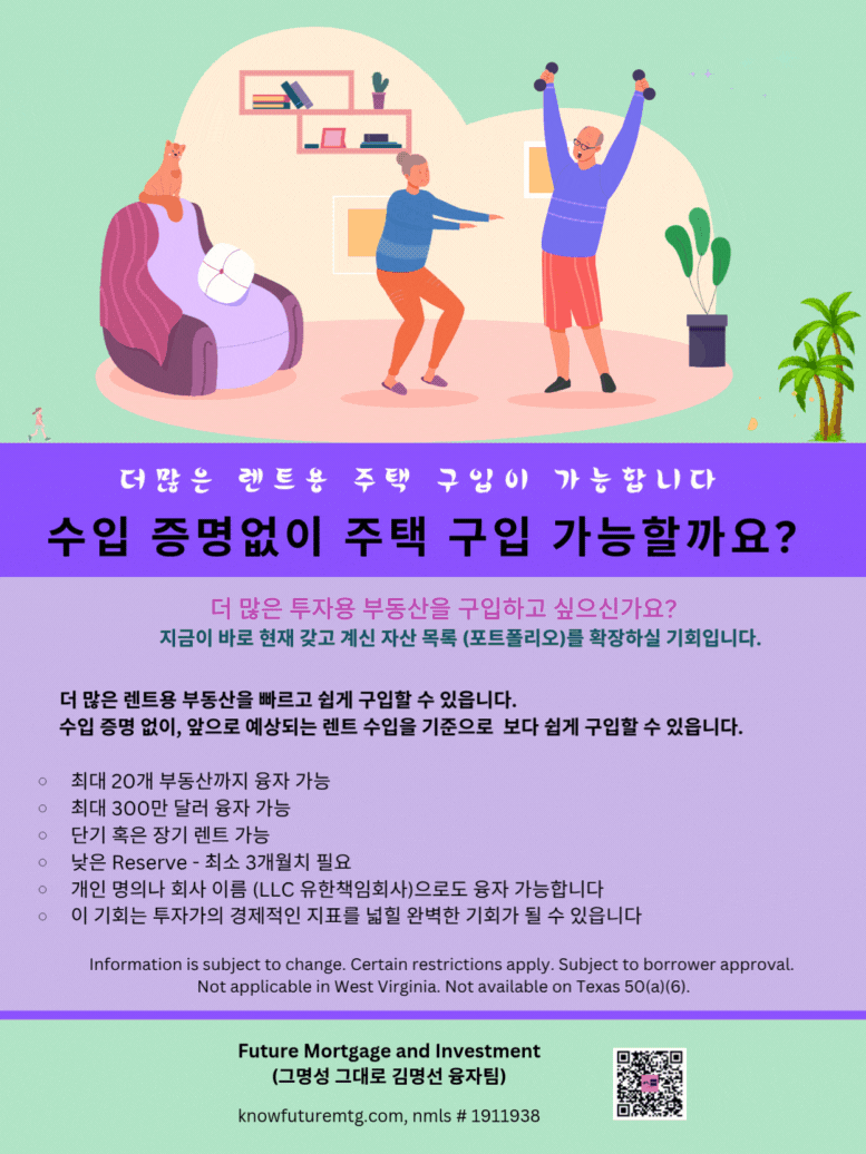 • 개인명의나 회사이름 (LLC 유한책임회사)으로도 융자 가능 합니다