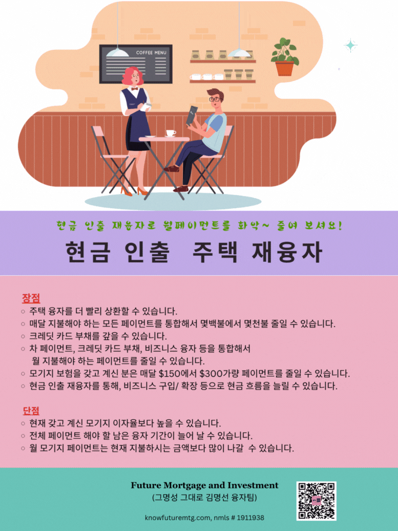 현금 인출 재융자로 월페이먼트를 화악 ~ 줄여 보셔요!