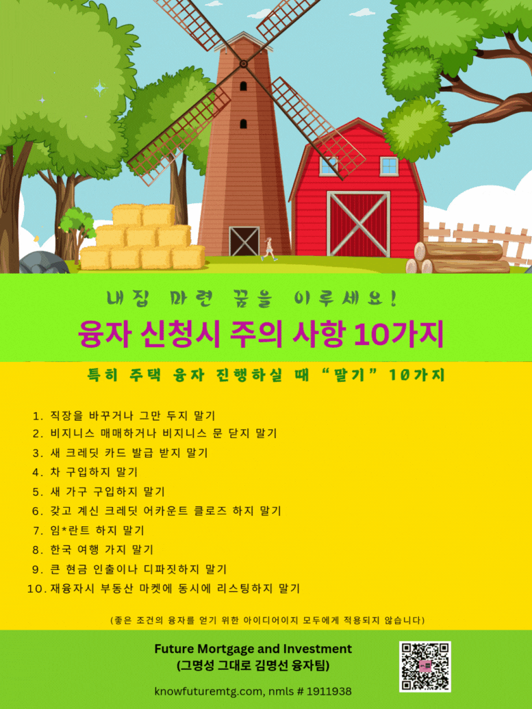 주의 사항: 융자는 돈 (신용)이고 돈 (신용) 은 빚입니다. 융자를 잘 활용하면 자산 증식이나 경제 생활에 큰 이익을 주지만, 그렇지 못할 경우, 집을 잃거나 경제적인 파국의 원인이 될수 있읍니다. 육체적인 고통이나 정신적인 고통은 911을 누르시고, 채무로 인한 경제적인 고통은 CFPB, Financial Counselor 혹은 가까운 융자 전문가에게 문의 하셔요.