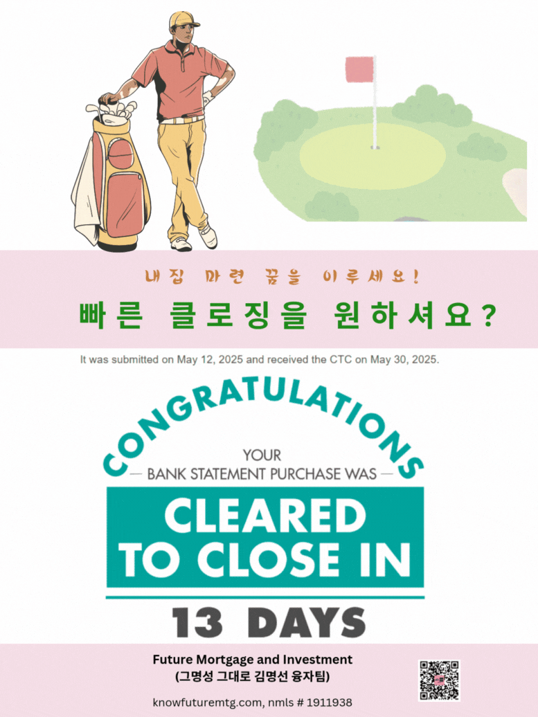 주의 사항: 융자는 돈 (신용)이고 돈 (신용) 은 빚입니다. 융자를 잘 활용하면 자산 증식이나 경제 생활에 큰 이익을 주지만, 그렇지 못할 경우, 집을 잃거나 경제적인 파국의 원인이 될수 있읍니다. 육체적인 고통이나 정신적인 고통은 911을 누르시고, 채무로 인한 경제적인 고통은 CFPB, Financial Counselor 혹은 가까운 융자 전문가에게 문의 하셔요.