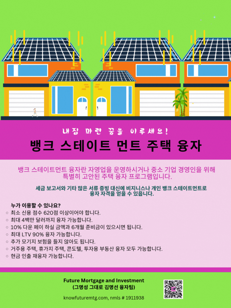 주의 사항: 융자는 돈 (신용)이고 돈 (신용) 은 빚입니다. 융자를 잘 활용하면 자산 증식이나 경제 생활에 큰 이익을 주지만, 그렇지 못할 경우, 집을 잃거나 경제적인 파국의 원인이 될수 있읍니다. 육체적인 고통이나 정신적인 고통은 911을 누르시고, 채무로 인한 경제적인 고통은 CFPB, Financial Counselor 혹은 가까운 융자 전문가에게 문의 하셔요.