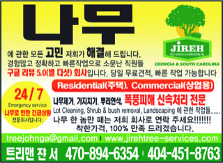 * 나무제거( tree removal), 가지치기(pruning), 뿌리연삭( stump grinding), 폭풍피해처리( storm damage cleaning), Lot cleaning, Landscaping(pine straw, plants & flowers installation...) 펜스(fence), Patio, Sod installation(잔디깔기), Hardscaping...