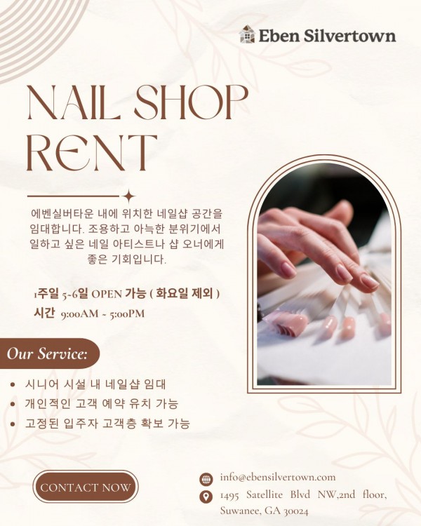 스와니에 위치한 에벤실버타운 시니어시설 내에 위치한 네일샵 공간을 임대합니다.