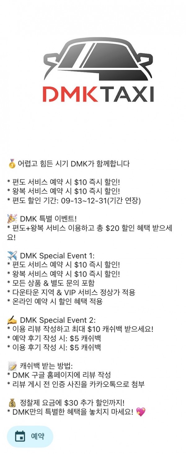 ✅ 편도+왕복 서비스 총 $20 할인 혜택—DMKTAXI.com ✅