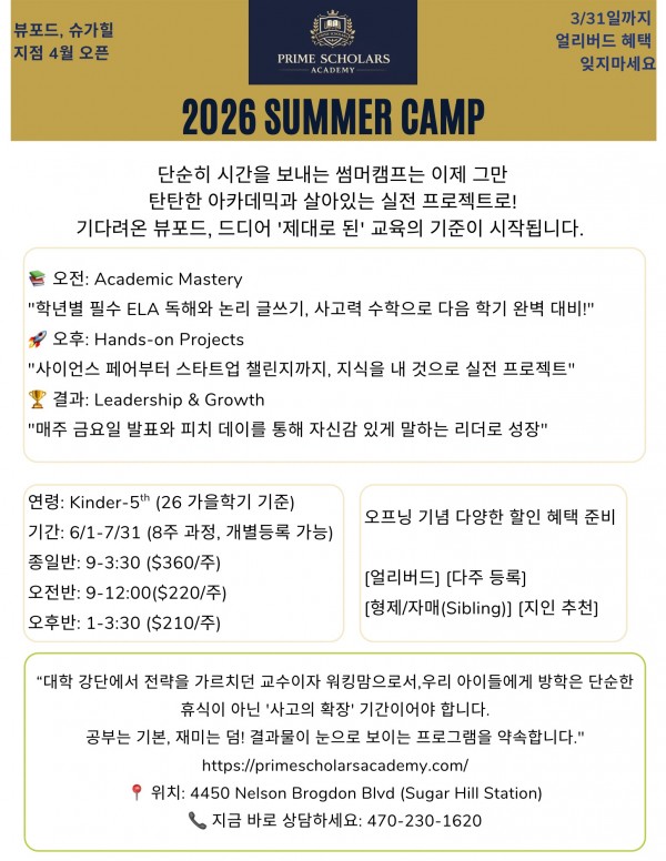 아카데믹과 펀캠프 동시에 섬머캠프 오픈 - 뷰포드, 슈가힐, 스와니