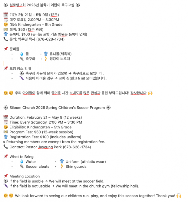 ⚽️ 실로암교회 2026년 봄학기 어린이 축구교실 ⚽️