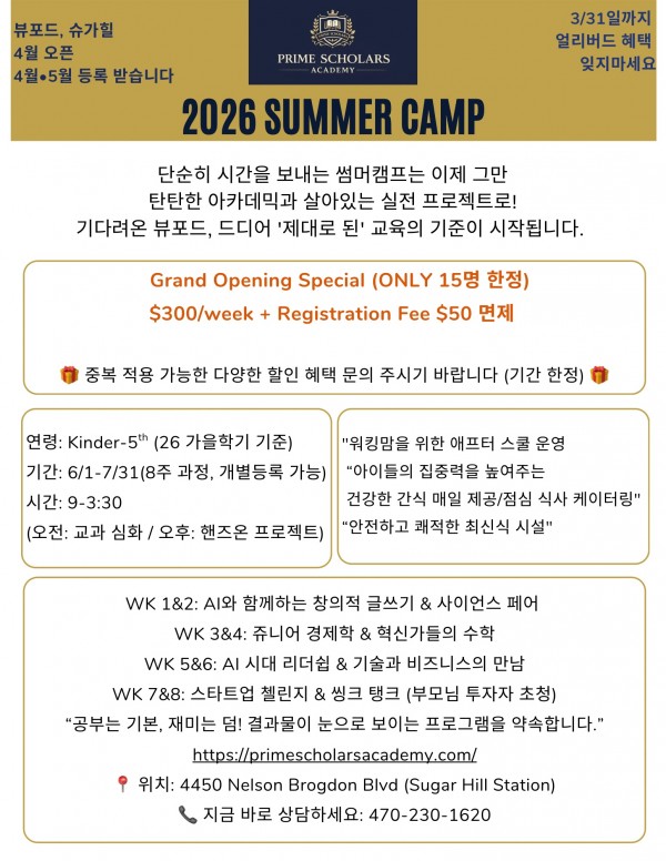 그랜드 오프닝 얼리버드 단 15분께만 드리는 혜택 - 뷰포드 스와니 섬머캠프