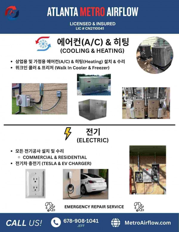 상업용 및 가정용 HVAC, 에어컨(A/C), 히팅(Heating), 워크인 쿨러, 워크인 프리저, 설치 및 수리.(LICENSED & INSURED)